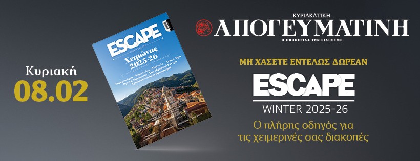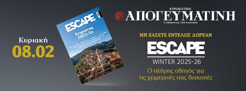 Μη χάσετε αυτή την Κυριακή 08.02 εντελώς δωρεάν αποκλειστικά με την κυριακάτικη Απογευματινή, τον πλήρη οδηγό για τις χειμερινές σας διακοπές Escape Winter 2025-26!